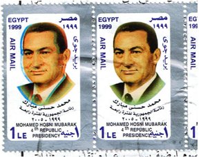 | Q79 July, 2010 member 240 ŁE1 Hosni Mubarak 4th Term (SG 2123, NP1458) 1mm leftward slip. I was very surprised to see that Lot 639 did not sell in the recent Auction 49. It is an unrecorded horizontal strip of three of the 1999 ŁE1 Hosni Mubarak 4th Term (SG 2123, NP1458) air mail, used on a small parcel card with illegible markings. The left-hand stamp, alone remarkably, shows a prominent 1mm leftward slip in the pale blue colour. Is there a printing expert who could tell me how this could possibly have happened? |
