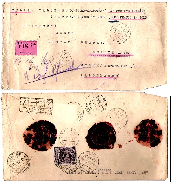 reply member ESC 188 I have been wrestling with the franking of Insured Mail for years, but I think that on this cover it may be calculated as follows, and have reconciled three or four Insured frankings using this method: The weight of the item (which has to be stated on the front) is G 16 (G=grams), and this has to be Translated into the basic surface rate, i.e. 20 mills The ordinary Registration Fee has to be paid - 20 mills The Insurance fee, on a packet with a declared value of less than 300 francs 25 mills Making 65 mills in all. With 15m already affixed, it leaves 50m, but the space on the cover seems enough to accommodate a stamp the same size again, BUT the 50m value of the UPU set is a larger stamp! Or, did it have a 50m 2nd Fuad? This area is a minefield, because we see so few covers work with. I think the pink label V 18 is a continuation number for Suez only, I have seen various examples for Alexandria which show different numbers. Apart from the “V” label, insured covers often have a red label (similar size to the ordinary Registered label) with INSURED and VALUE DECLARES below in black. I am surprised the envelope seems to have only three wax seals: five were definitely called for, one at each corner & one in the middle. |