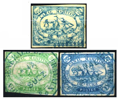| Q93 September, 2011 member 628 Suez Canal cancels I hope members might be able to help me with information about the attached Suez Canal cancellations. The single scan was cancelled with little blue lozenges ... not those of Ismailia (dots), nor those of Suez (circular and the lozenges were bigger). So where has it come from? The other two stamps are both cancelled “Direction Générale des Travaux” in a double-ring outer circle, with “Canal de Suez” in the centre. I have the usual references, including Boulad d’Humières, Ringstrom & Tester’s Ship Letters of the World, and no postal marking of this type is known, but may I ask a question: Could it be that the company created this canceller only for internal postage or another purpose? |