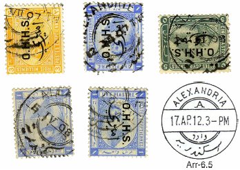 | Q94 September, 2011 member 483 Alexandria postmark Query 94 Alexandria postmark - from Peter Heim (ESC 384) This row of stamps all show a postmark similar to the Alexandria postmark classified as Arr 6.5, but without the A in the upper segment and the waarid (Arabic for “Arrival” in the lower part. My dates run from ..VII 07 to ..VII 08. I have 14 copies, and all but one are on De La Rue stamps of the first OHHS bilingual overprint issue (1907). Some years ago I reported these postmarks to Lars Alund, but he had never seen an example of it. I suppose that they might be predecessors of the so-called double-bridge Arr 6.5. It would be of interest if there is a complete cover which proves that it is an arrival-postmark of Alexandria. |