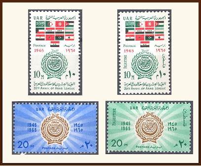 Above (left) is the two-stamp set issued in Egypt on March 25, 1965, to mark the Twentieth Anniversary of the Arab League; and on the right are the Gaza versions, the 10m stamp retaining the same colours with the incorporation of the words "Palestine" while the 20m value also had a change of colour