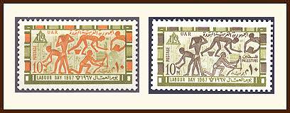 The last stamp to be issued for Gaza - June 1, 1967, Labour Day - just before the Six Day War when Israeli captured the Gaza Strip and the Sinai. At left is the Egyptian stamp; at right its Gaza equivalent with colour change and "Palestine". Israel held Sinai until the peace treaty in the 1980s returned it to Egypt. In the process Egypt renounced all future claims to the Gaza Strip.