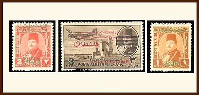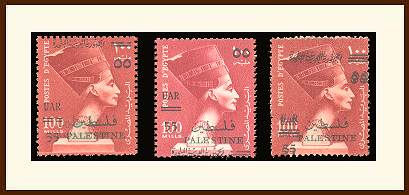 Palestine stamps can be a happy hunting ground for overprint specialist. Shown above is the 100 millièmes Nefertiti surcharged stamp of January 20, 1959, the leftmost stamp is doubly overprinted with Palestine; the centre example has the surcharge misplaced upward; and that at the right has the surcharge doubled.