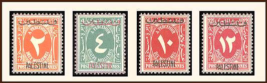 Stamps other than definitives were similarly treated, with postage dues, commemoratives etc. first being issued with overprints and then some reissued with the Arabic and English words for "Palestine" incorporated in the design, usually with distinctive colour changes from the Egypt version.
