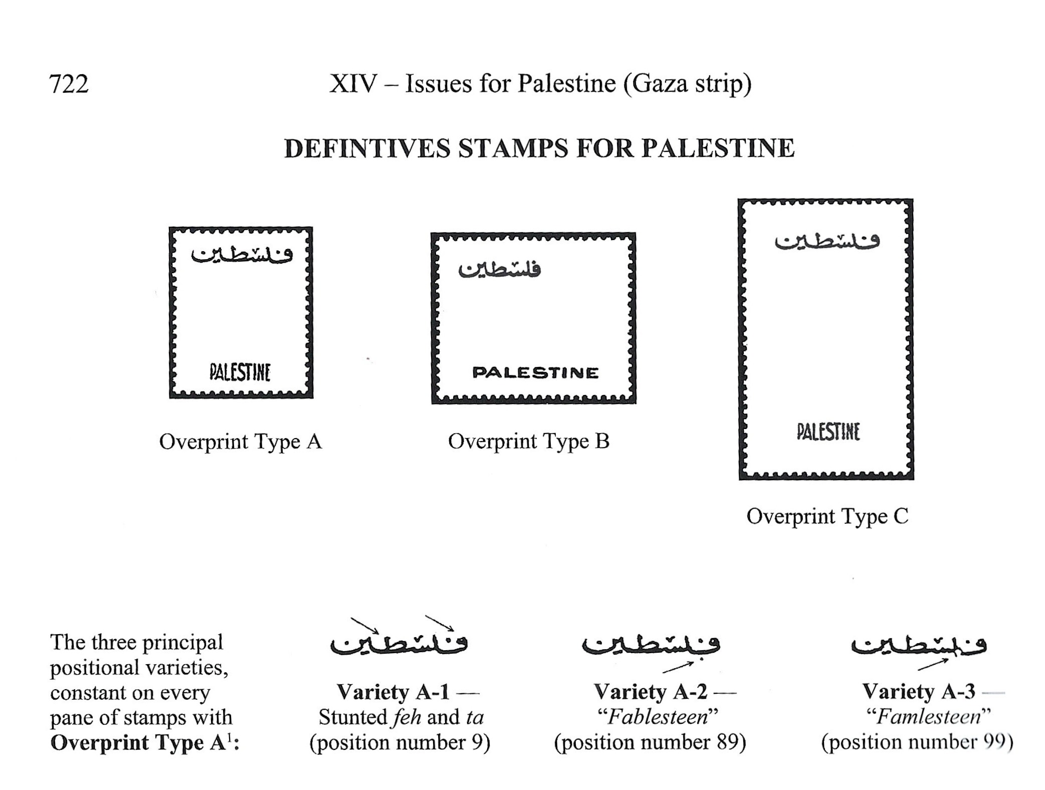 From 1960 the stamps issued for the Gaza Strip were printed specially using the current Egyptian stamps but in different colours and with the word "Palestine" inscribed in the design, both in English and Arabic.