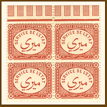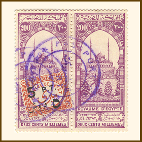The "no value" stamp was replaced by others with nominated values and departmental handstamps with franking value. Remaining stocks were overprinted 1, 2, 3 and 5 PT (piastres) with values in English and Arabic. These stamps were used as fiscals.
