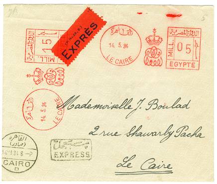 Cover that has been passed twice through the Nessim machine - once to pay the standard letter rate, 5 millièmes,